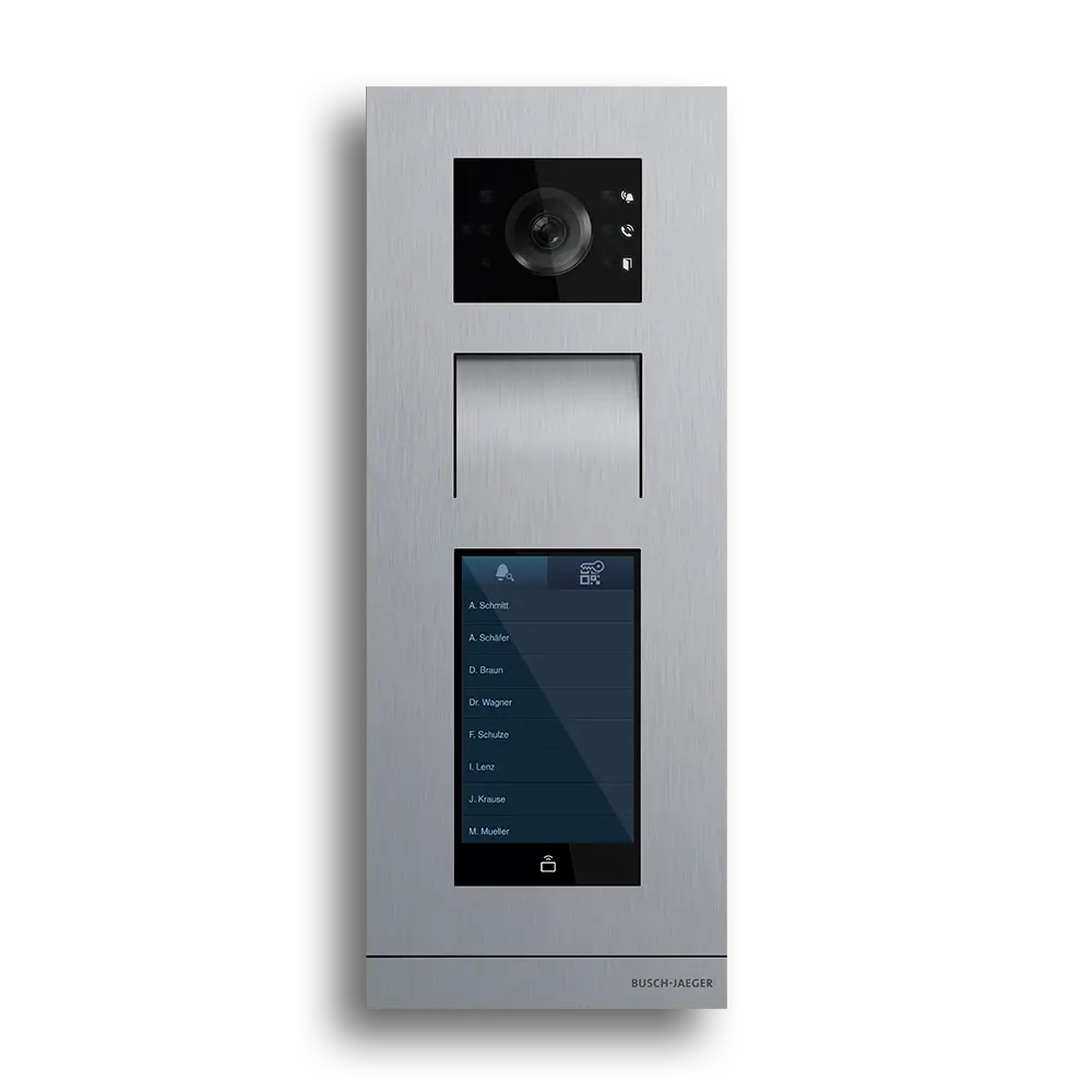 Die Außenstation mit integrierter HD-Videokamera für das Busch-Welcome® IP System ermöglicht dir die Kommunikation und Zutrittskontrolle mit Personen vor deiner Tür. Das 5" Farb-Touchdisplay bildet digital die Klingeltasten ab. Außerdem ist ein RFID-Leser zum Öffnen der Tür in der Außenstation integriert.